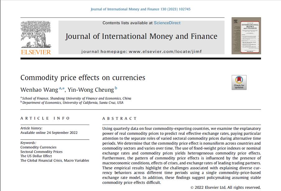 免费成人影片 教师王文浩作为第一作者与加州大学圣克鲁兹分校教授Yin-Wong Cheung合作的论文“Commodity price effects on currencies”,在期刊Journal of International Money and Finance在线发表(2022年9月)。该期刊为SSCI二区期刊,期刊最新影响因子为2.762,属我校A1类期刊。