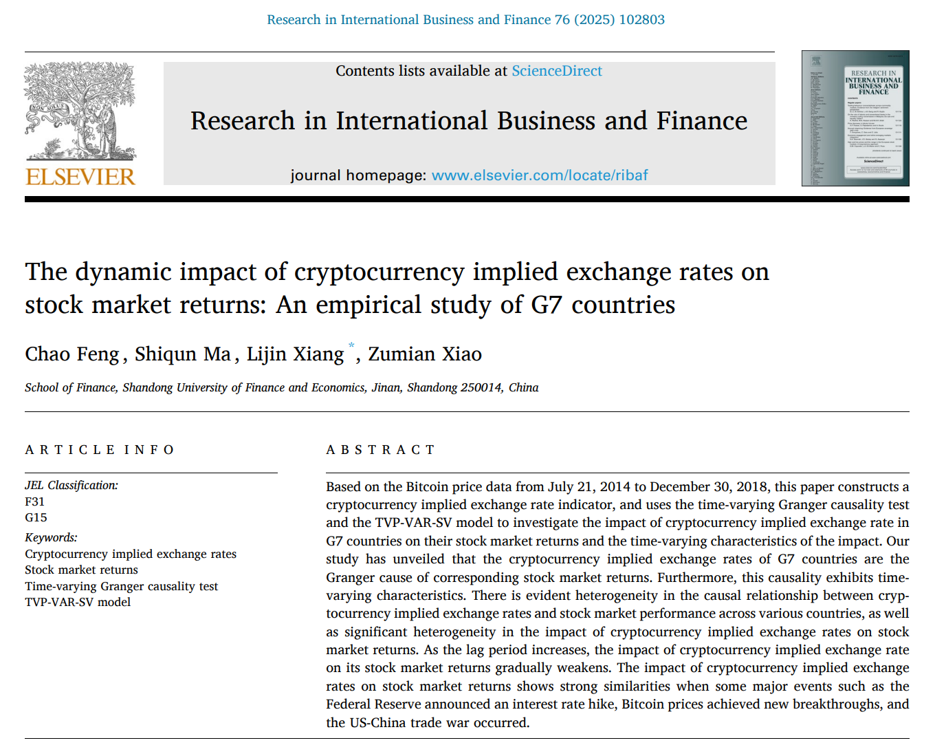 免费成人影片 副教授向丽锦作为通讯作者与博士生封超、马世群及副教授肖祖沔合作的论文《The dynamic impact of cryptocurrency implied exchange rates on stock market returns: An empirical study of G7 countries》在期刊《Research in International Business and Finance》在线发表(2025年2月)。该期刊为SSCI一区期刊,期刊最新影响因子为6.3,属我校A1类期刊。