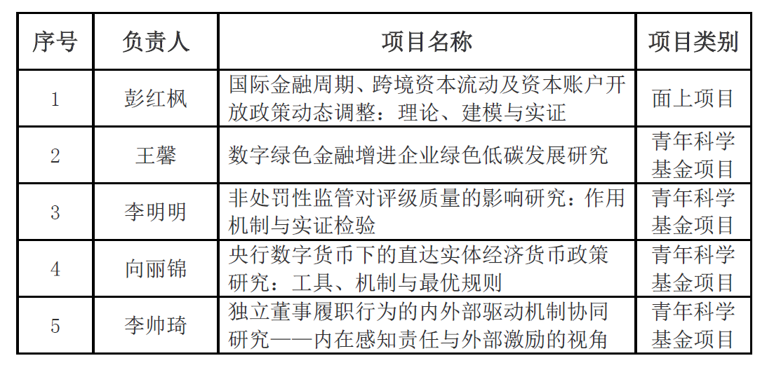 彭红枫教授的《国际金融周期、跨境资本流动及资本账户开放政策动态调整:理论、建模与实证》获面上项目资助;王馨教授(预聘)的《数字绿色金融增进企业绿色低碳发展研究》、李明明副教授的《非处罚性监管对评级质量的影响研究:作用机制与实证检验》、向丽锦副教授(预聘)的《央行数字货币下的直达实体经济货币政策研究:工具、机制与最优规则》和李帅琦副教授(预聘)的《独立董事履职行为的内外部驱动机制协同研究——内在感知责任与外部激励的视角》获青年科学基金项目资助。