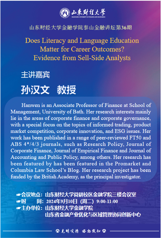 孙汉文 (Hanwen Sun)英国巴斯大学(University of Bath)金融学助理教授,美国金融协会(AFA)会员,国际财务管理协会(FMA)会员,欧洲金融协会(EFA)会员,欧洲会计协会(EAA)会员。研究方向:内幕交易,卖空交易,股权结构,公司金融以及公司治理。