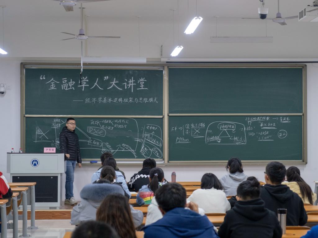 讲座伊始,尹老师指出西方经济学是经济学的共同基础,并带领大家深入思考经济学的核心。尹老师结合日常生活,生动阐述了厂商和消费者的互动关系,在此基础上引出了第三个主体——金融部门,并引导同学们了解三者存在的问题和解决方案,串联了许多经济学概念。随后,尹老师话锋一转,指出这三者看似良好的互动,实际存在诸多潜在问题,如厂商的公共物品、污染问题,消费者的高储蓄问题,随后提出了解决措施即“政府”,简要说明了政府的宏观审慎管理、定向降准降息等手段。在此机制的基础上,尹老师引出对外开放等问题,提出了三元悖论,并以欧盟为例,引出解决措施之一即建立最优货币区,由内到外构建起了经济学基本逻辑框架。尹老师介绍了经济学模型IS—LM—BP,推荐阅读书籍、电影等,并对本次讲座内容做了简要梳理,强调一切复杂内容都没有背离最基础的理性人假设。讲座最后,尹老师向大家推荐了对金融工作很有帮助的python软件,并鼓励同学们积极思考生活中的经济学问题,培养深度思维,站上更广阔的平台。