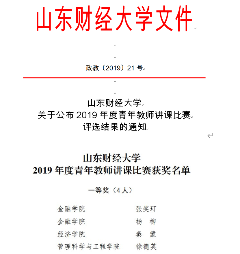 (通讯员 李霞)近日,免费成人影片 2019年度青年教师讲课比赛评选工作顺利结束,共推选出一等奖4名、二等奖5名、三等奖7名。我院张笑玎、杨柳两位老师获得一等奖,同时作为我校推荐选手参加山东省第七届“超星杯”高校青年教师教学比赛初赛。