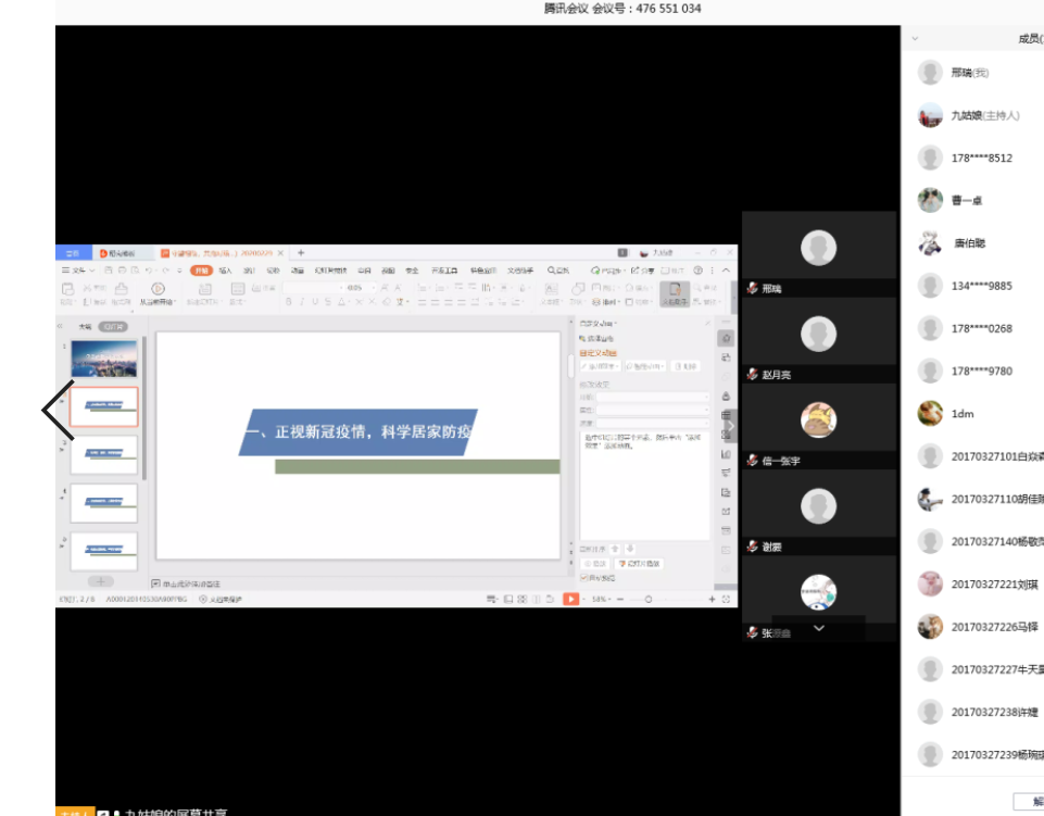 按照学校党委学工部的通知要求,免费成人影片 副书记与辅导员利用腾讯会议视频,通过线上平台分别与分管的班级组织召开新学期战“疫”云班会,函盖62个班,2839本科生、研究生。