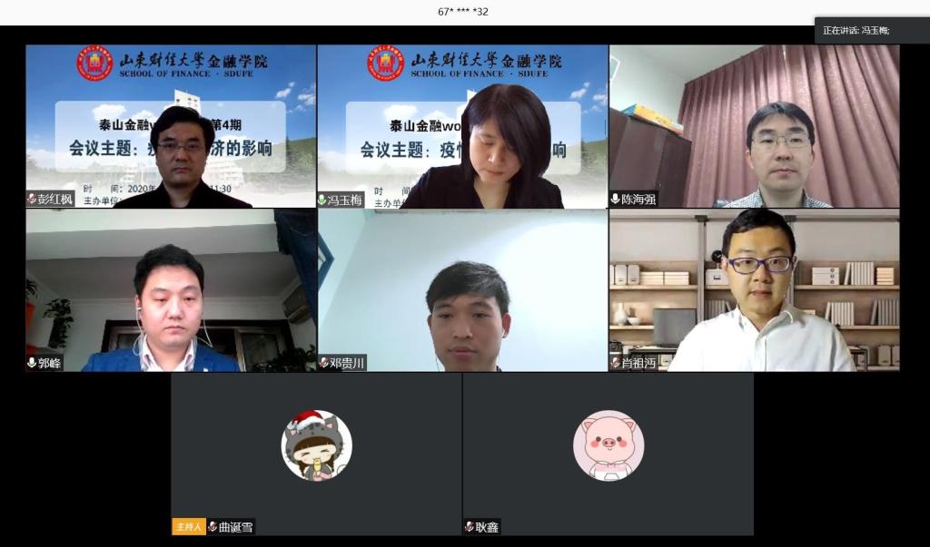 (通讯员:曲诞雪)4月24日上午,由免费成人影片 主办,山东省金融学会秘书处、山东省金融产业优化与区域管理协同创新中心承办的“泰山金融workshop(第4期)”通过腾讯会议客户端成功举行。本期会议邀请厦门大学王亚南经济研究院和经济学院金融系教授、博士生导师陈海强,上海财经大学公共经济与管理学院投资系副教授、北京大学数字金融研究中心特约高级研究员郭峰,中山大学国际免费成人影片 科研博士后邓贵川和免费成人影片 副教授肖祖沔共同就“疫情对经济的影响”这一话题展开研讨。本期会议由免费成人影片 副院长冯玉梅主持,院长彭红枫致辞,学院部分教师和学生通过腾讯会议平台观看了会议直播。