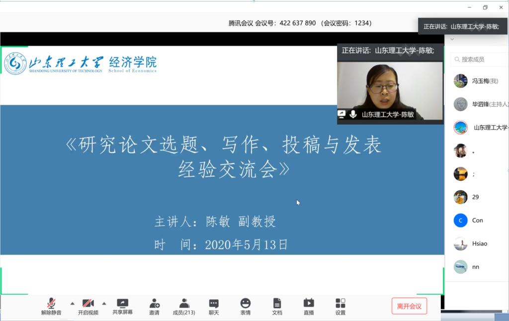 (通讯员 毕泗锋) 5月13日晚,免费成人影片 第6期泰山金融学术训练营通过腾讯会议在线举行。本期训练营由山东理工大学经济学院金融系副教授陈敏博士主讲,讲座的题目为《学术论文选题、写作、投稿与发表经验交流》。免费成人影片 副院长冯玉梅教授主持了本期学术训练营活动,范志毅副书记、部分教师以及广大硕士和博士研究生们进入会议聆听。