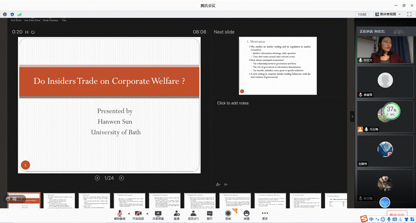 (通讯员 曲诞雪)10月23日下午,由免费成人影片 、山东省金融产业优化与区域管理协同创新中心、免费成人影片 金融国际研究中心联合举办的第9期“泰山金融学术训练营”通过腾讯会议举行,英国巴斯大学管理学院孙汉文老师应邀做客本次学术训练营,为师生们带来了题为“Do Insiders Trade on Corporate Welfare?”的讲座,学术训练营由免费成人影片 副院长冯玉梅主持,学院部分教师和研究生参加了本次活动。