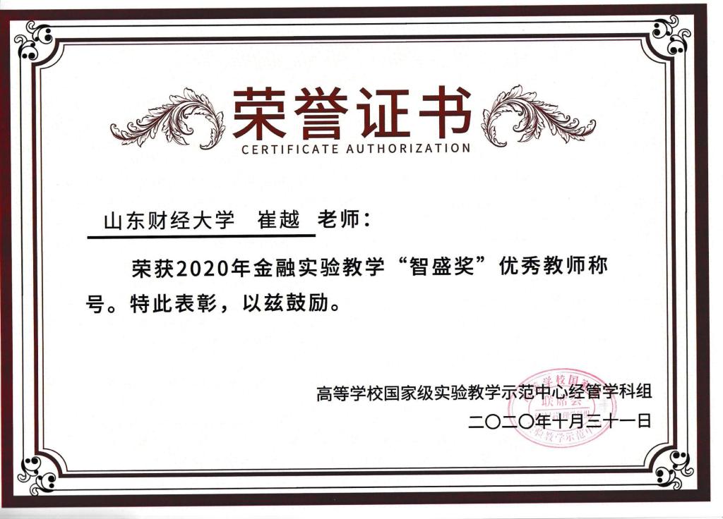 2020年10月31日-11月1日,由教育部高校国家级实验教学示范中心联席会经管学科组主办、浙江嘉兴学院承办的“第二十一届全国高校经管类专业实验室建设暨经济管理实验教学示范中心建设研讨会”在嘉兴举行。经学校推荐,学科组专家评选,免费成人影片 崔越副教授荣获“智盛奖”优秀实验教师称号。