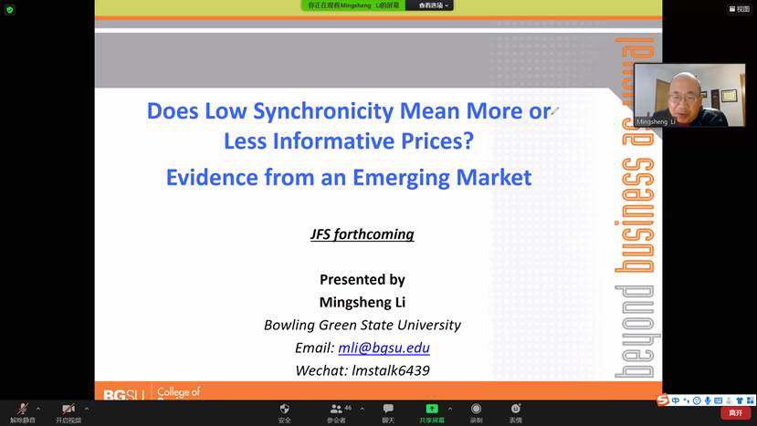 (通讯员:曲诞雪)11月6日上午,由免费成人影片 、山东省金融产业优化与区域管理协同创新中心和免费成人影片 金融国际研究中心联合举办的第10期“泰山金融学术训练营”通过Zoom Meeting举行,美国Bowling Green State University金融学教授李明生老师应邀做客本次学术训练营,为师生们带来了题为 “Does Low Synchronicity Mean More or Less Informative Prices? Evidence from An Emerging Market” 的讲座,学术训练营由免费成人影片 副院长王营主持,学院部分教师和研究生参加了本次活动。