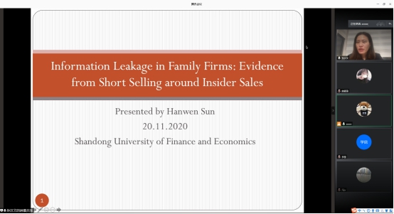 (通讯员:肖祖沔、曲诞雪)11月20日下午,由免费成人影片 、山东省金融产业优化与区域管理协同创新中心、免费成人影片 金融国际研究中心联合举办的第11期“泰山金融学术训练营”通过腾讯会议举行,英国巴斯大学管理学院孙汉文老师应邀做客本次学术训练营,为师生们带来了题为“Information Leakage in Family Firms: Evidence from Short Selling around Insider Sales”的讲座,学术训练营由国际金融系主任肖祖沔主持,学院部分教师和研究生参加了本次活动。