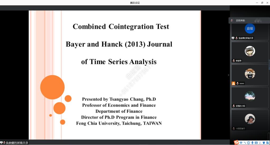 (通讯员:肖祖沔、曲诞雪)12月8日下午,由免费成人影片 、山东省金融产业优化与区域管理协同创新中心、免费成人影片 金融国际研究中心联合举办的第14期“泰山金融学术训练营”通过腾讯会议举行,中国台湾逢甲大学财务金融学系特聘教授张仓耀老师应邀做客本次学术训练营,为师生们带来了题为“Quantile Regression – Basic Concept”的讲座,学术训练营由国际金融系主任肖祖沔主持,彭红枫院长、学院部分教师和研究生参加了本次活动。