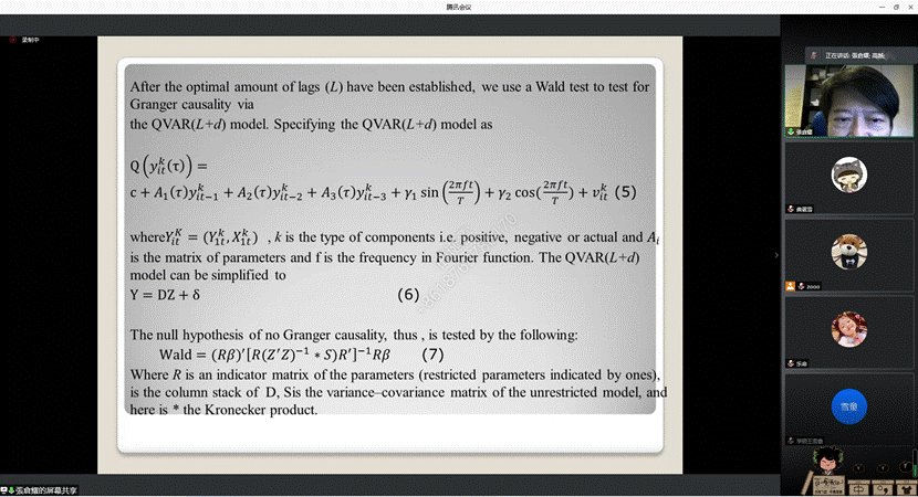 (通讯员:肖祖沔、曲诞雪)12月29日下午,由免费成人影片 、山东省金融产业优化与区域管理协同创新中心、免费成人影片 金融国际研究中心联合举办的第20期“泰山金融学术训练营”通过腾讯会议举行,中国台湾逢甲大学财务金融学系特聘教授张仓耀老师应邀做客本次学术训练营,为师生们带来了题为“Quantile-on-Quantile Regression”的讲座,学术训练营由国际金融系主任肖祖沔主持,学院部分教师和研究生参加了本次活动。