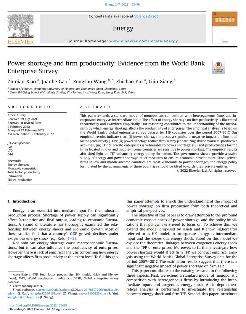 免费成人影片 肖祖沔副教授作为第一作者在国际能源领域顶级学术期刊《Energy》发表论文“Power shortage and firm productivity: Evidence from the World Bank Enterprise Survey”(2022年5月第247卷)。该期刊系JCR及中科院SCI一区期刊,2021年影响因子为7.147,属我校A1类期刊。合作者包括免费成人影片 教师向丽锦、尹智超及本科生高娟荷,香港城市大学硕士研究生王宗树。