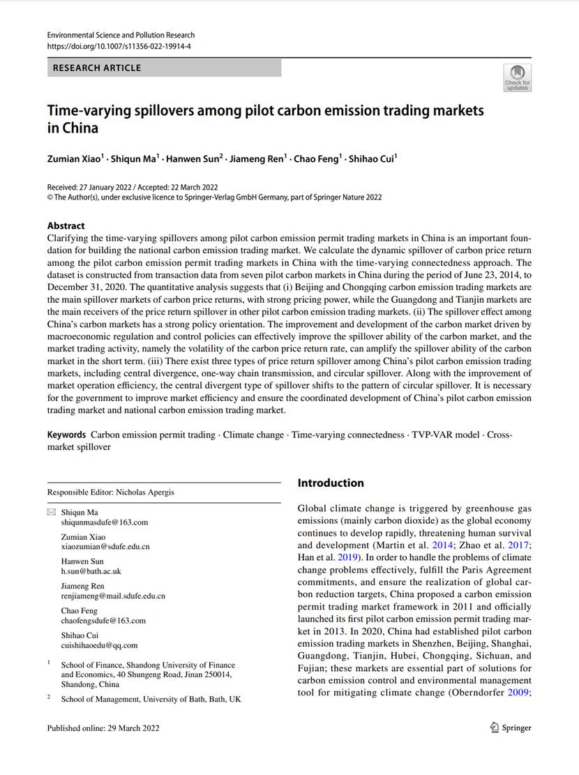 免费成人影片 肖祖沔副教授作为第一作者在期刊《Environmental Science and Pollution Research》发表论文“Time‑varying spillovers among pilot carbon emission trading markets in China”(2022年第3期)。该期刊系JCR二区SCI期刊,影响因子为4.223,属我校A2类期刊。合作者包括英国巴斯大学助理教授孙汉文;免费成人影片 硕士研究生马世群、封超及本科生任佳萌、崔世豪。