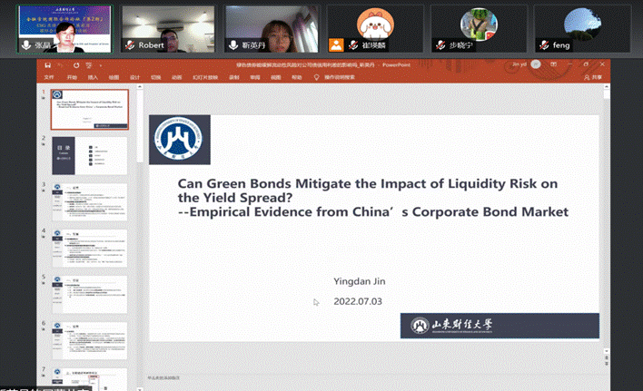随后,靳英丹同学汇报了论文《Can Green Bonds Mitigate the Impact of Liquidity Risk on the Yield Spread?——Empirical Evidence from China’s Corporate Bond Market》。该文基于2016-2021年中国上市公司发行的债券数据,通过面板模型证实绿色债券市场较之普通债券,进一步加剧了流动性风险对信用利差的影响程度,并通过将信用利差分解得到违约价差,进一步证实绿色债券市场的流动性风险对债券违约价差存在传导效应。Robert教授就模型构建方面进行了指导,黄方亮教授则在倾向得分匹配方法的合理性角度等方面提出了相关建议,其他老师认为需要进一步考虑内生性问题。