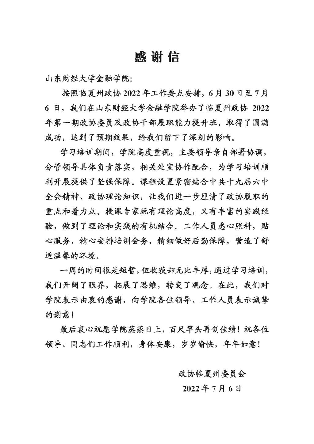 承接培训任务后,免费成人影片 EDP中心与州政协办公室和委员工作委员会严格按照州政协党组安排部署,认真研究谋划,反复推敲培训方案,量身定制培训内容,精心准备“精神食粮”和实践教学,在培训地点、教学内容、培训形式等方面进行了精心谋划和细致筹备,在州政协和学院的共同努力下圆满完成各项培训任务,顺利结业返程。培训班结束后,州政协对免费成人影片 提供的培训和服务表示满意,特发来感谢信表达培训后的收获和对工作人员诚挚的谢意。