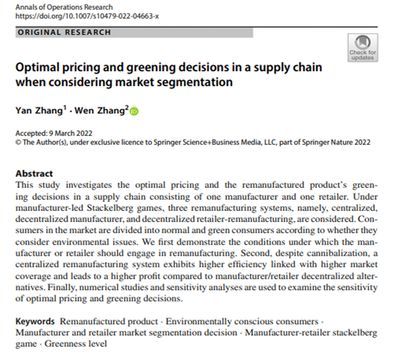 免费成人影片 教师张艳作为第一作者发表的论文,“Optimal pricing and greening decisions in a supply chain when considering market segmentation”,在期刊 Annals of Operations Research 在线发表(2022年3月)。该期刊系运筹学与管理科学SCI三区期刊,最新影响因子为6.1,属我校A2类期刊。