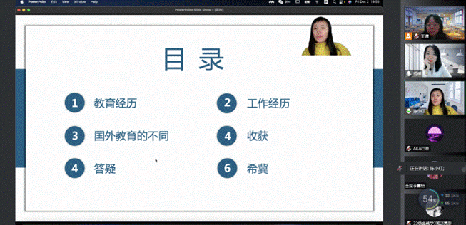 陈小红老师分别从自己的教育工作经历、留学过程中的收获、国内外教育的差异等方面,分享了自己丰富多彩的留学生活,强调了留学经历对开拓视野、完善提升自我的重要意义。另外,陈小红通过分享留学相关网站解答了同学们关于留学申请条件、流程、费用、课程设置等方面的问题。