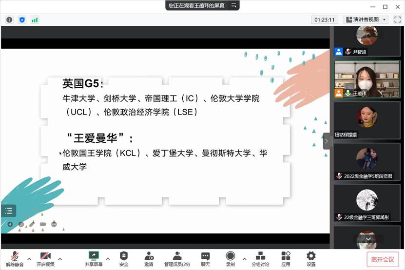 王蕴玮首先以详实的数据为同学们分析了当前国内考研和就业形势、出国留学优势;然后,分析了英国主要高校的基本情况,分享了在英国生活学习的课程形式、住宿、花费问题。最后,王蕴玮就申请英国高校可能遇到的问题、奖学金问题进行了分析,根据自身经验为有意向出国留学的同学提出“提升学习成绩”、“丰富学习经历”“提升语言水平”的要求,有助于同学们丰富个人简历和提高文书水平,做好留学的前期准备。