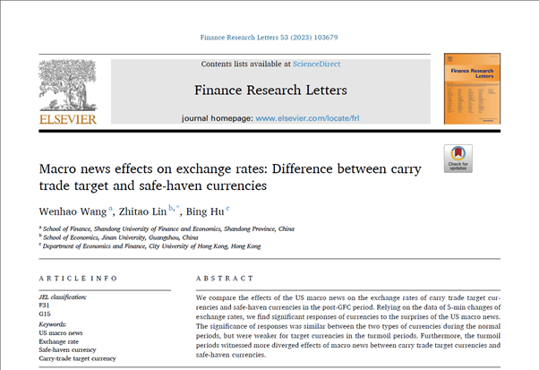 免费成人影片 教师王文浩作为第一作者与暨南大学林智韬博士、香港城市大学胡冰博士合作的论文“Macro news effects on exchange rates: Difference between carry trade target and safe-haven currencies”,在期刊Finance Research Letters正式发表(2023年5月)。该期刊为SSCI一区期刊,期刊最新影响因子为9.846,属我校A1类期刊。