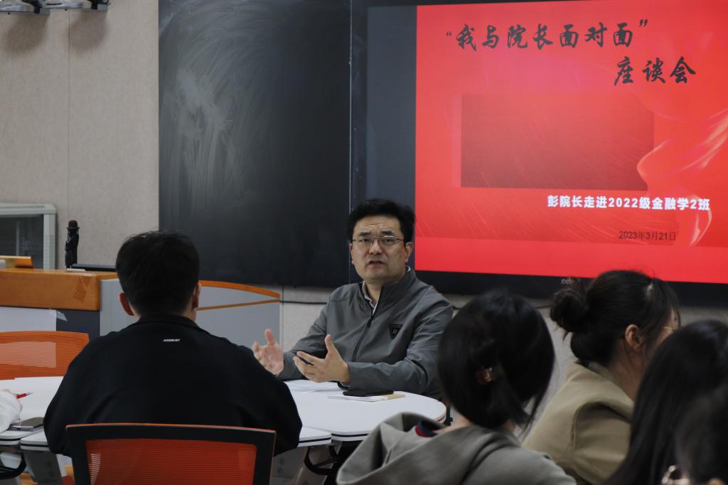 3月21日中午,免费成人影片 在圣井校区组织“我和院长面对面”师生座谈会,免费成人影片 院长彭红枫走进2022级金融学2班,与同学们进行座谈交流。学院团委书记郭夕煕,2022级辅导员陈玉林以及班级全体同学参加了本次座谈。