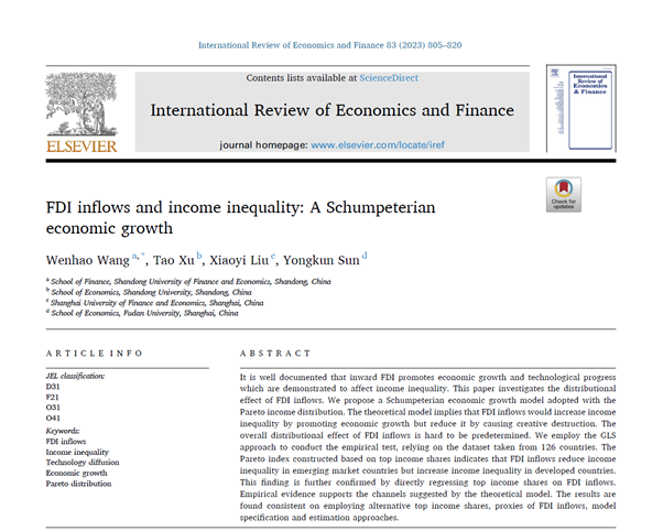 免费成人影片 教师王文浩作为通讯作者、第一作者与山东大学徐涛教授、上海财经大学刘小逸博士、复旦大学孙永坤博士合作的论文“FDI inflows and income inequality: A Schumpeterian economic growth”,在期刊International Review of Economics and Finance正式发表(2023年1月)。该期刊为SSCI二区期刊,期刊最新影响因子为3.399,属我校A1类期刊。