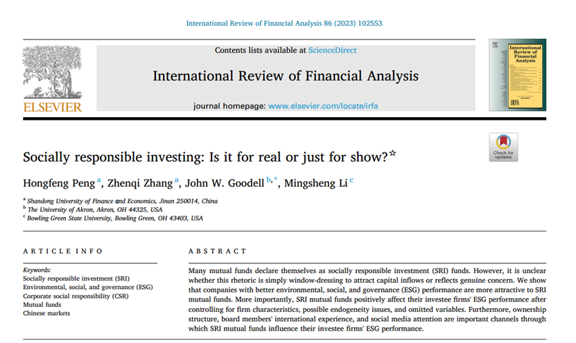 免费成人影片 彭红枫教授作为第一作者与硕士生张榛岂、美国阿克伦大学John W. Goodell教授、美国鲍林格林州立大学李明生教授合作的论文“Socially responsible investing: Is it for real or just for show?”在期刊International Review of Financial Analysis正式发表(2023年1月)。该期刊为SSCI一区期刊,期刊最新影响因子为8.235,属我校A1类期刊。