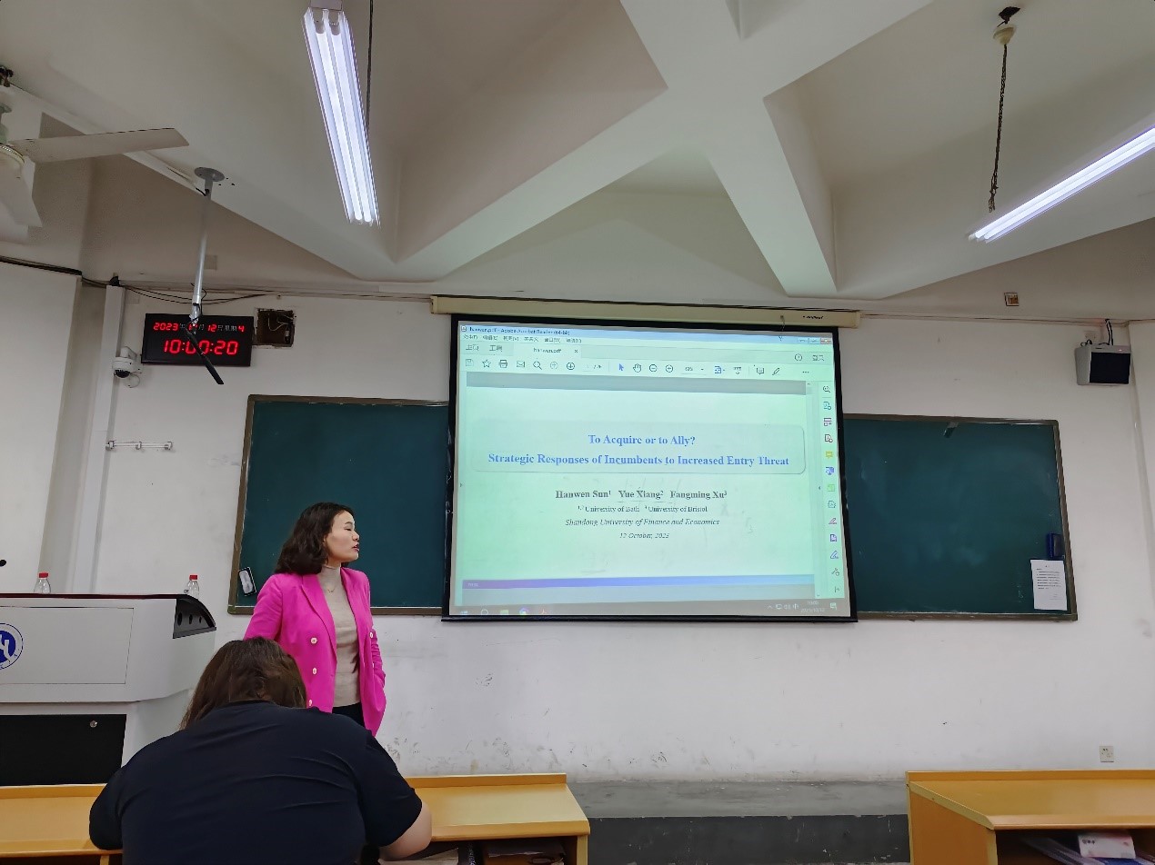 孙教授的这篇文章调查了美国进口关税的降低促进外国企业的进入,竞争者进入当地市场如何影响当地企业之间的选择:企业收购和战略联盟。论文使用1990年1月1日至2020年12月31日期间美国国内联盟和收购交易的数据,发现美国进口关税的降低行为导致的外部竞争的增加,导致公司在外部增长决策中优先考虑联盟而不是收购。文章的研究结果首次表明,竞争冲击会间接和因果地影响现代企业在收购和联盟之间的外部增长选择。论文宣讲结束后,孙教授与学院师生就相关问题展开了热烈的学术讨论。