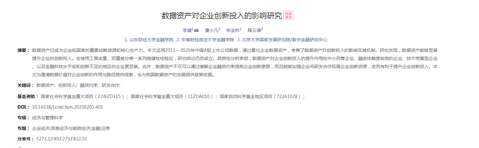 免费成人影片 青年教师李健与中南财经政法大学董小凡博士、张金林教授、北京大学国家发展研究院陶云清博士合作撰写的论文《数据资产对企业创新投入的影响研究》在《外国经济与管理》2023年5期发表。该期刊属于我校A2期刊。