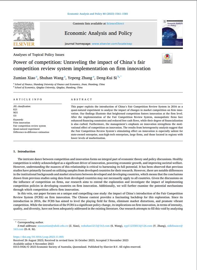 免费成人影片 肖祖沔副教授指导硕士研究生王姝涵撰写的论文“Power of competition: Unraveling the impact of China's fair competition review system implementation on firm innovation”在期刊Economic Analysis and Policy正式发表(2023, Vol.80, Issue: Dec.)。该期刊为SSCI二区期刊,最新影响因子为6.5,属我校A1类期刊。