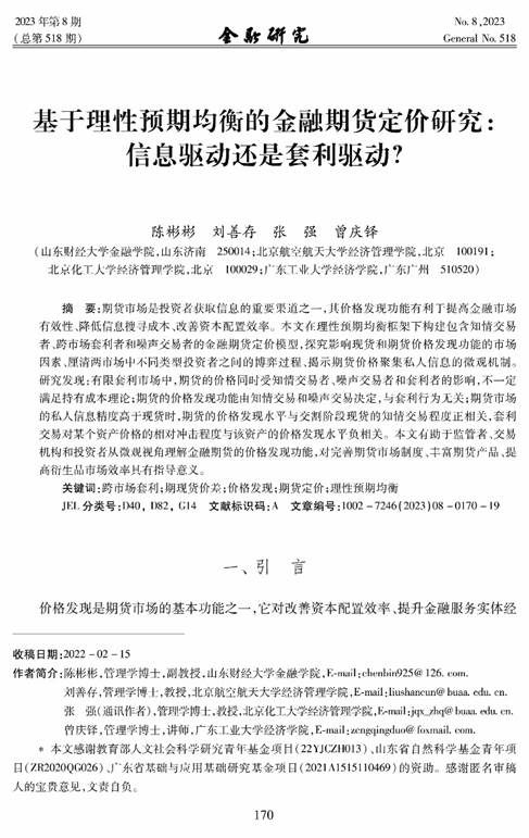 免费成人影片 教师陈彬彬(第一作者)与北京航空航天大学刘善存教授、北京化工大学张强教授(通讯作者)和广东工业大学曾庆铎合作撰写的论文《基于理性预期均衡的金融期货定价研究:信息驱动还是套利驱动?》在《金融研究》2023年第8期发表。该期刊属于我校A1期刊。