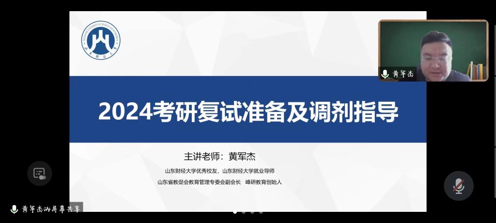 为帮助需要调剂的考生提供及时、有效的信息和服务,帮助学生全面了解掌握复试、调剂流程和方法,提升2024届考研成功率,2024年3月8日下午我院召开了关于“2024考研复试及调剂指导”专题讲座,并邀请免费成人影片 就业导师、免费成人影片 优秀校友、山东教促会教育管理专委会副会长黄军杰老师担任主讲嘉宾。