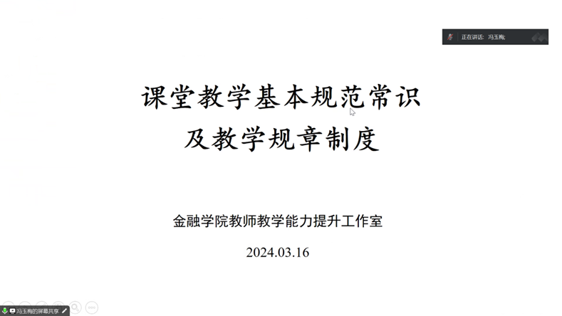 新学期伊始,为培养和提升新入职青年教师的教学能力,免费成人影片 教师教学能力提升办公室于2024年3月16日举办了以《课堂教学基本规范常识及教学规章制度》为主题的线上座谈会。本次座谈会由我院教学、管理经验丰富的冯玉梅教授主讲,近两年新入职青年教师与会。
