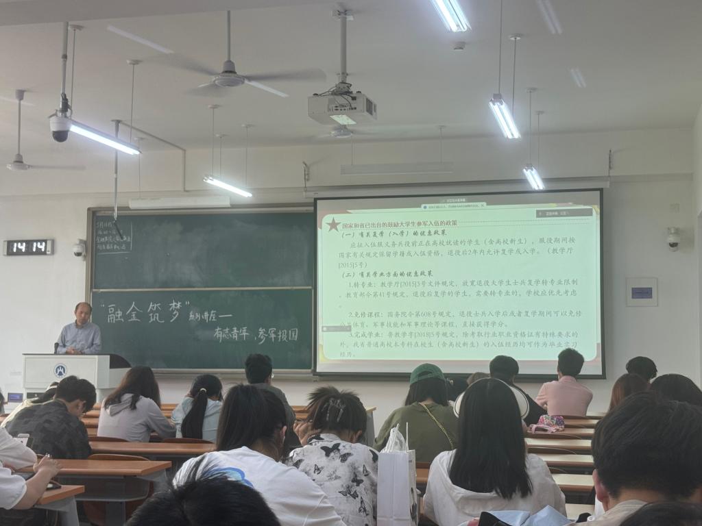 积极响应国家号召,以高度的责任感和使命感,组织系列专题讲座,以激发同学们的爱国情怀和报国决心,鼓励同学们积极参军入伍,为实现国家稳定和国防事业的发展贡献一份青春力量。