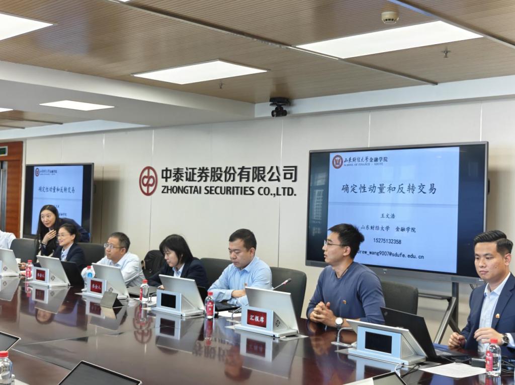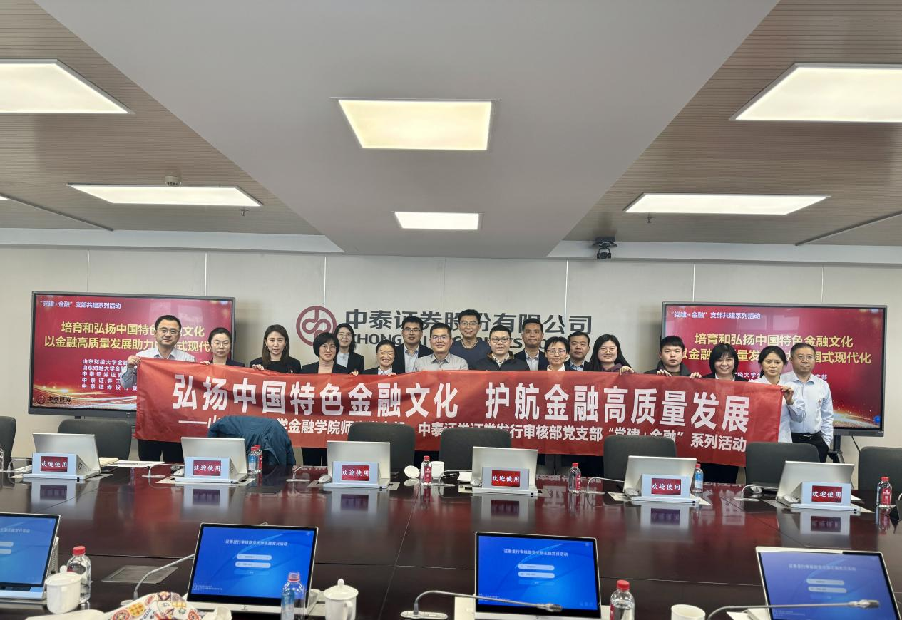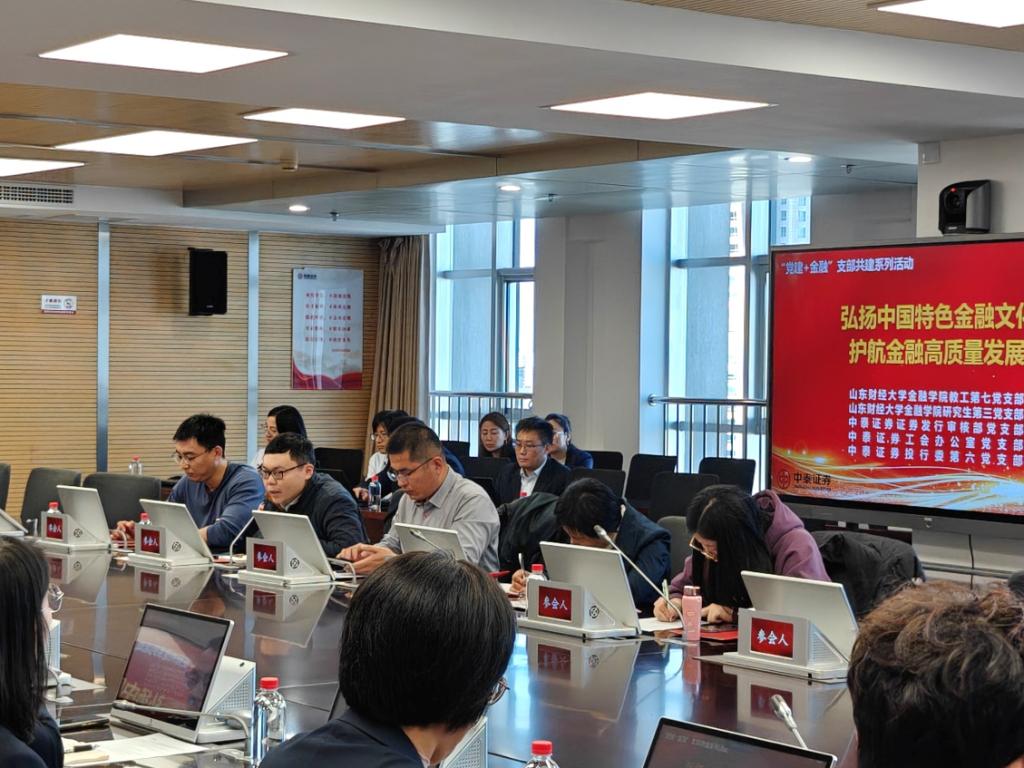 为深入学习宣传贯彻党的二十大精神,进一步坚定理想信念,激发党员队伍的凝聚力,11月28日,由免费成人影片 副院长王营带队,免费成人影片 教工第七党支部、研究生第三党支部与中泰证券证券发行审核部党支部、中泰证券工会办公室党支部、中泰证券投行委第六党支部联合开展“弘扬中国特色金融文化,护航金融高质量发展”支部共建活动。活动由中泰证券证券发行审核部党支部书记战肖华主持。