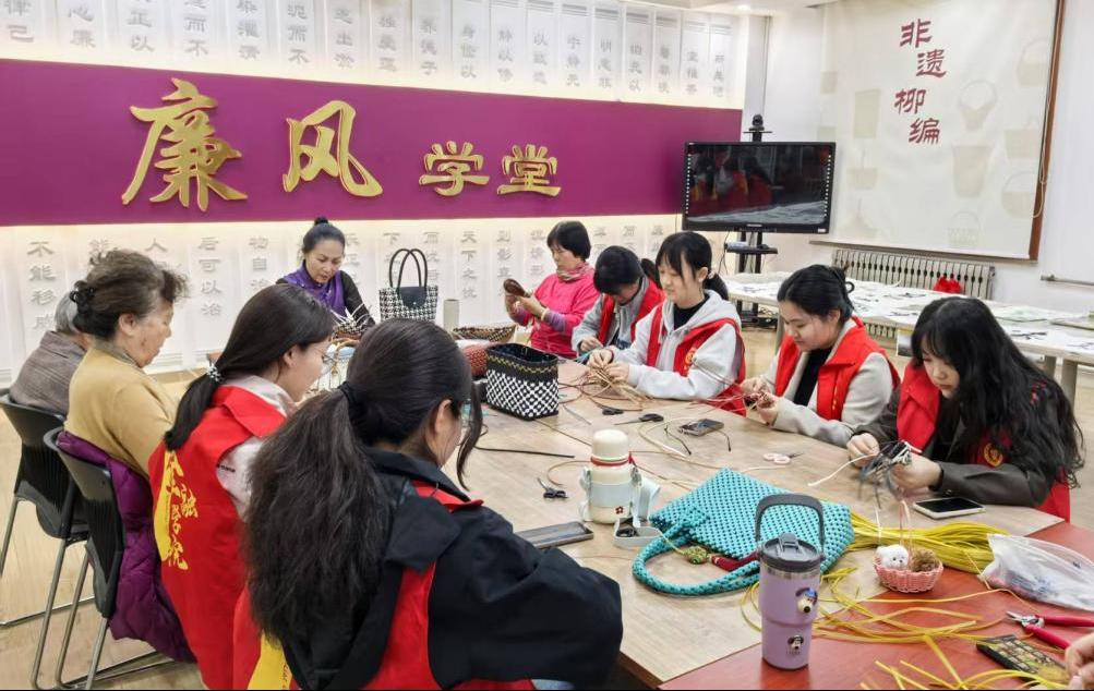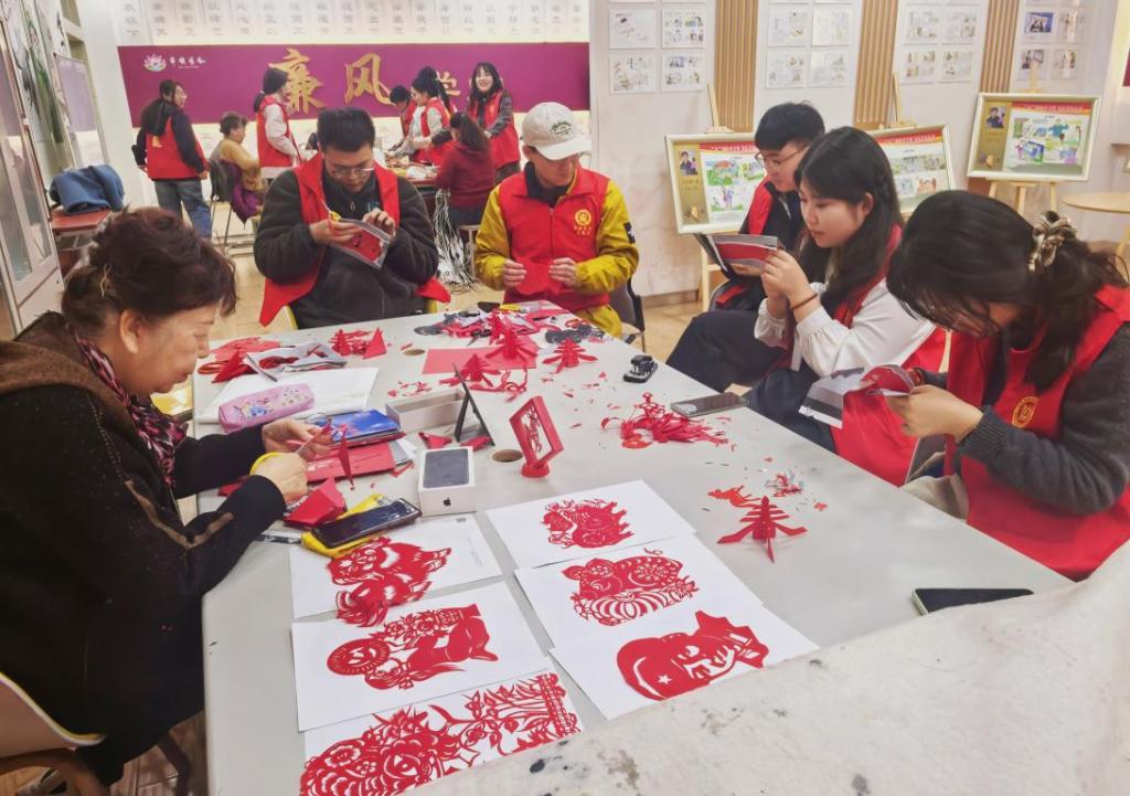 上午九时,志愿者们到达服务中心开展主题志愿活动,体验柳编和剪纸艺术。