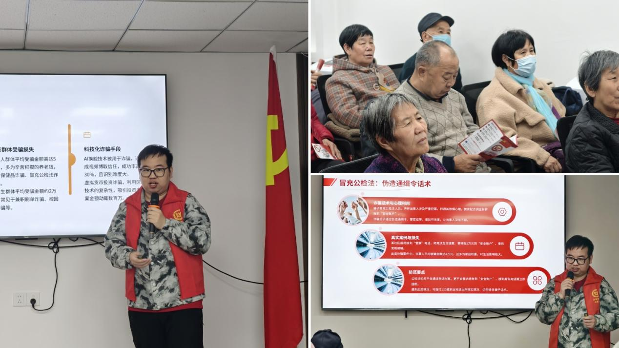 志愿者们利用自己的专业知识给老年人们带来了生动有趣的反诈骗讲座,总结出了“不怕、不信、大贪、不转、一打”的“五不一打”防骗口诀。针对老年人心理防范意识不强、辨别能力弱等特点,分享了“刷单返利”“养老诈骗”“虚假投资”等典型案例,深入剖析诈骗手段,提醒居民不轻信、不转账、不泄露个人信息。志愿者们通过情景模拟和互动问答,生动演示了如何识别钓鱼链接、核验可疑信息等实用技巧。