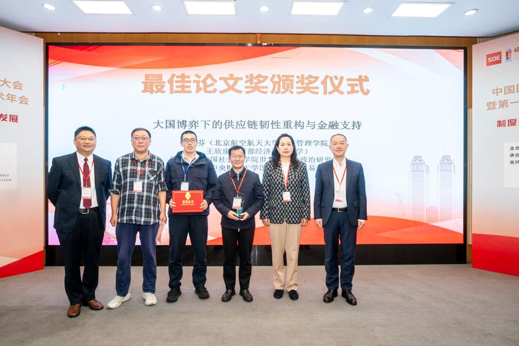北京航空航天大学的谭小芬及其合作者王欣康(首都经济贸易大学)、吴立元(中国社会科学院)、段玉婉(中央财经大学)共同完成的论文《大国博弈下的供应链韧性重构与金融支持》获得本届年会最佳论文奖。广东免费成人影片 金融与投资学院院长项后军、辽宁大学中国金融研究院副院长杨丽、中国银行上海市分行长三角金融研究院院长张兴荣共同为获奖者颁奖。