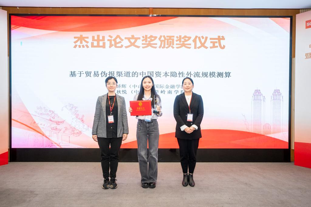 中山大学杨娇辉和江秋悦合作的论文《基于贸易伪报渠道的中国资本隐性外流规模测算》获得本届年会杰出论文奖。山东大学经济学院副院长张群姿、重庆工商大学免费成人影片 院长王兰共同为获奖者颁奖。