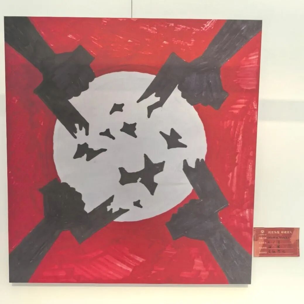 2024级金融学4班袁广宇同学的作品《铭记抗战 铸魂育人》,以宣传画的形式生动展现了四只握紧的拳头共同扯碎法西斯标志的画面,象征着全世界所有热爱和平、坚守正义的人民团结一心取得中国抗日战争及世界反法西斯战争的伟大胜利。该作品不仅凝练了抗战精神,更传递出世界人民大团结的宏大主题,引导观者铭记历史,珍视和平。