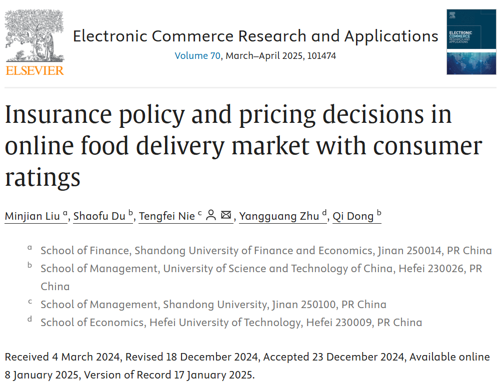 免费成人影片 讲师刘敏建以第一作者与中国科学技术大学管理学院杜少甫教授、山东大学管理学院聂腾飞教授、合肥工业大学经济学院讲师朱扬光以及中国科学技术大学管理学院博士生董齐合作撰写的论文《Insurance policy and pricing decisions in online food delivery market with consumer ratings》在《Electronic Commerce Research and Applications》2025年第70卷(Volume 70, March–April 2025, 101474)发表。该期刊为SSCI一区期刊,期刊最新影响因子为5.9,属我校A2类期刊。