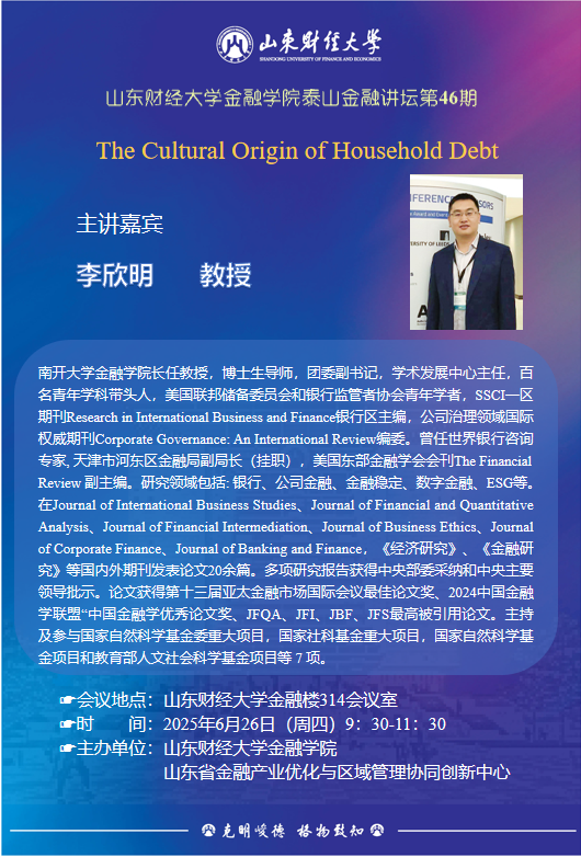 李欣明,南开大学免费成人影片 长任教授,博士生导师,团委副书记,学术发展中心主任,百名青年学科带头人,美国联邦储备委员会和银行监管者协会青年学者,SSCI一区期刊Research in International Business and Finance银行区主编,公司治理领域国际权威期刊Corporate Governance: An International Review编委。曾任世界银行咨询专家, 天津市河东区金融局副局长(挂职),美国东部金融学会会刊The Financial Review 副主编。研究领域包括: 银行、公司金融、金融稳定、数字金融、ESG等。在Journal of International Business Studies、Journal of Financial and Quantitative Analysis、Journal of Financial Intermediation、Journal of Business Ethics、Journal of Corporate Finance、Journal of Banking and Finance,《经济研究》、《金融研究》等国内外期刊发表论文20余篇。多项研究报告获得中央部委采纳和中央主要领导批示。论文获得第十三届亚太金融市场国际会议最佳论文奖、2024中国金融学联盟“中国金融学优秀论文奖、JFQA、JFI、JBF、JFS最高被引用论文。主持及参与国家自然科学基金委重大项目,国家社科基金重大项目,国家自然科学基金项目和教育部人文社会科学基金项目等 7 项。