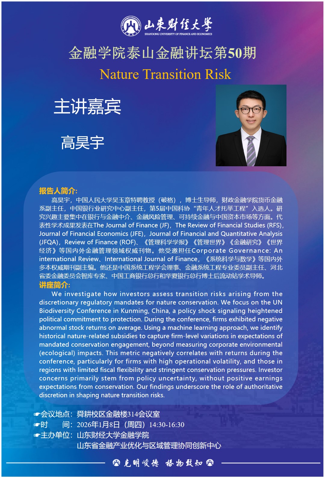 高昊宇,中国人民大学吴玉章特聘教授(破格),博士生导师,财政免费成人影片 货币金融系副主任,中国银行业研究中心副主任,第5届中国科协“青年人才托举工程”入选人。研究兴趣主要集中在银行与金融中介、金融风险管理、可持续金融与中国资本市场等方面。代表性学术成果发表在The Journal of Finance (JF),The Review of Financial Studies (RFS)Journal of Financial Economics (JFE), Journal of Financial and Quantitative Analysis(FQA),Review of Finance (ROF)、《管理科学学报》《管理世界》《金融研究》《世界经济》等国内外金融管理领域权威刊物。他受邀担任Corporate Governance:Aninternational Review、International Journal of Finance,《系统科学与数学》等国内外多本权威期刊副主编。他还是中国系统工程学会理事、金融系统工程专业委员副主任、河北省委金融委员会智库专家、中国工商银行总行和华夏银行总行博士后流动站学术导师。