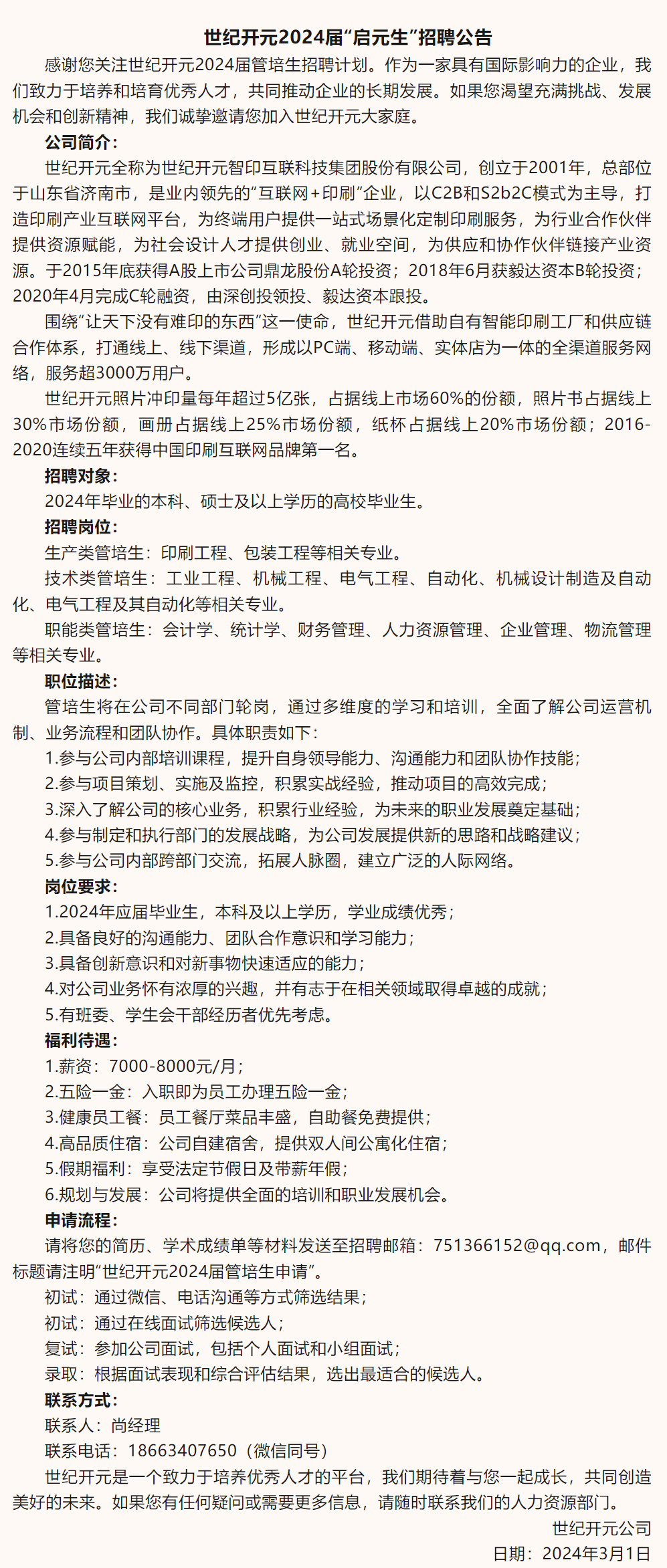 世纪开元2024届“启元生”招聘公告