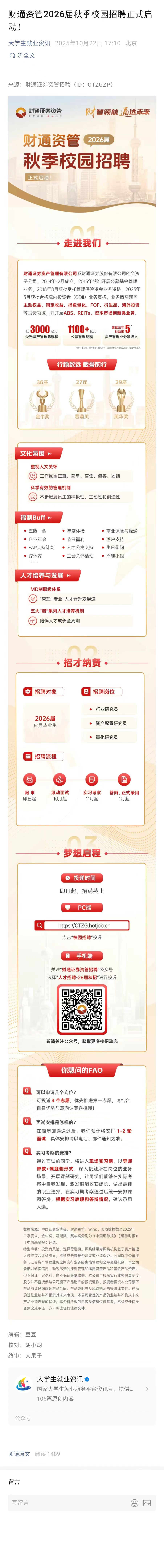 财通资管2026届秋季校园招聘正式启动