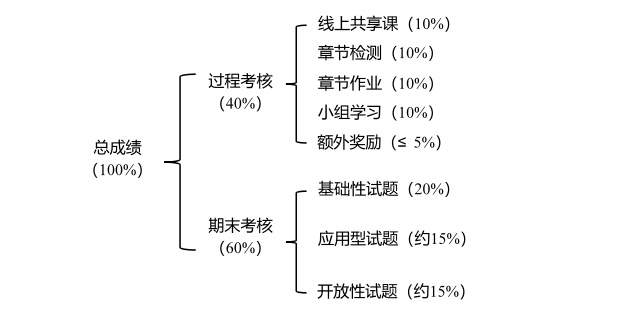 为适应教学改革需要,激发学生学习热情,团队将课程平时成绩占比由过去的30%提升到40%,并细化采分依据。平时成绩采分点包括共享课学习、章节测验、章节作业、小组学习等,每学期的过程考核次数超过20次。除此之外,设置奖励性分值,对于课堂表现突出、线上互动优秀、学习中具有批判精神的学生进行赋分奖励,单生整个学期奖励分值合计不超过5分。